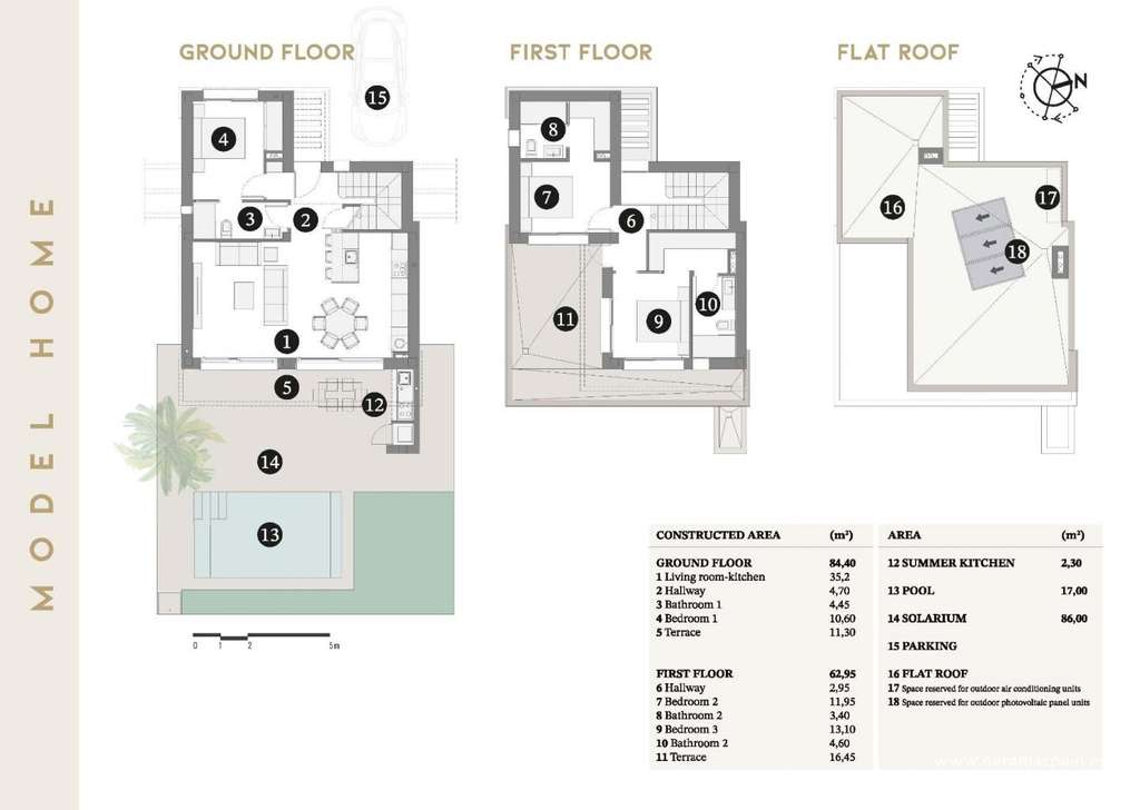 Acabados de alta calidad y características premiumEstas propiedades han sido construidas con altos estándares, con acabados de primera calidad e instalaciones modernas, que incluyenPuerta de entrada de seguridad reforzadaPersianas motorizadasCocina totalmente amueblada con electrodomésticos incluidosBaños con muebles, espejos y calefacción por suelo radiantePreinstalación para aire acondicionado por conductosPiscina privadaDos paneles solares fotovoltaicos con microinversor