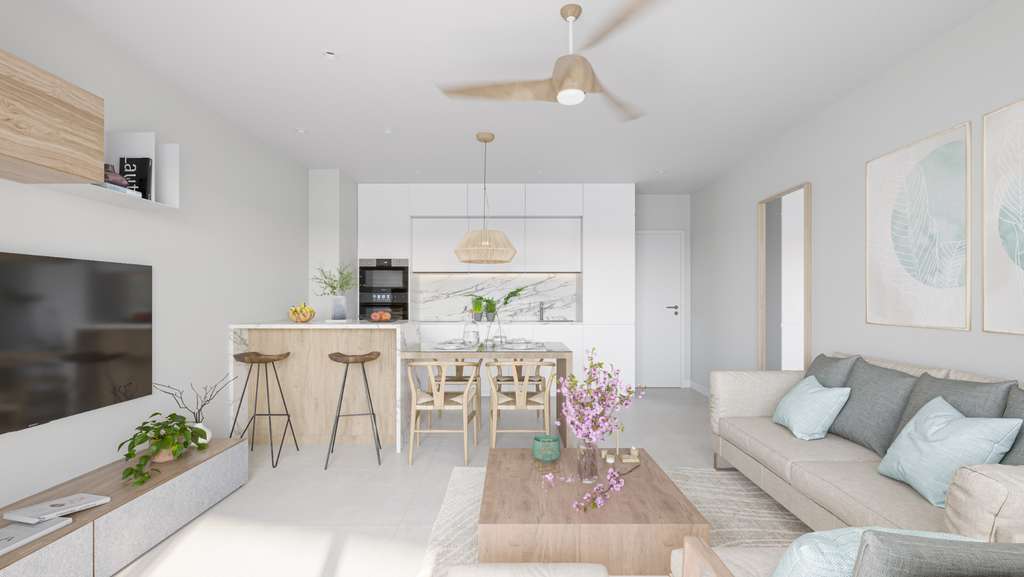Los pisos están diseñados con una distribución espaciosa y diáfana, con salón, comedor y cocina perfectamente integrados. La cocina está equipada con modernos armarios superiores e inferiores, e incluye una placa, un horno y un extractor de alta calidad. Además, los pisos cuentan con preinstalación de aire acondicionado y fibra óptica de alta velocidad, lo que garantiza el confort y la conectividad.