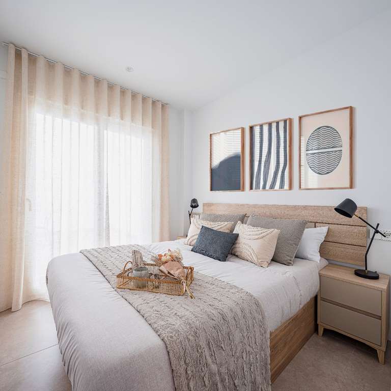 Los pisos de la planta baja le ofrecen un espacio de vida luminoso y acogedor. La moderna cocina, totalmente equipada, está conectada por grandes puertas correderas de cristal, que bañan el interior de luz natural. Dos generosos dormitorios, incluyendo un dormitorio principal con baño en-suite. En el exterior, disfrutará de una terraza en la parte delantera y un amplio patio en la parte trasera, perfectos para relajarse o cenar al aire libre.