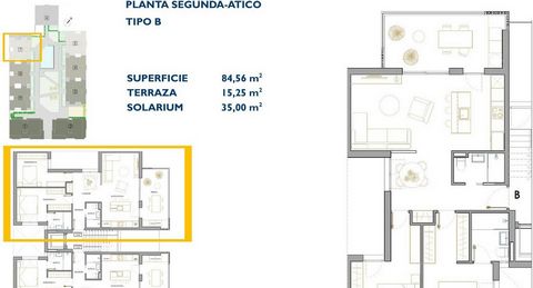 Apartamentos en planta baja con jardín privado y áticos en planta alta con solarium privado.