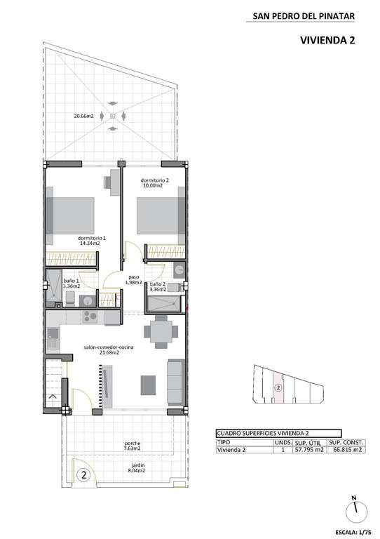 Bungalows de nueva construcción en San Pedro del Pinatar - Ubicación privilegiada a sólo 500 m de la playa Exclusivas viviendas de estilo boutique cerca de la costa Descubra estos elegantes bungalows de nueva construcción en el corazón de San Pedro del Pinatar, a sólo 500 metros de las impresionantes playas del Mar Menor. Esta promoción boutique incluye sólo ocho viviendas exclusivas, que combinan diseño moderno, confort y un tranquilo estilo de vida costero. Modelos disponibles para adaptarse a su estilo de vida Modelo Jardín/Planta Baja: Cuenta con una terraza delantera y un amplio patio trasero, perfecto para vivir al aire libre. Modelo Ático Loft: Incluye un solarium privado en la azotea y una terraza delantera, que ofrecen vistas abiertas y abundante luz solar. Detalles del modelo Garden/Planta Baja Entre en un luminoso salón que conecta a la perfección con el comedor y una cocina totalmente equipada. Las grandes puertas correderas de cristal dejan entrar la luz natural, creando un ambiente abierto y acogedor. La distribución incluye dos amplios dormitorios, el principal con baño en-suite y un moderno baño familiar. Aspectos destacados del modelo Ático Se accede al ático a través de una escalera privada que conduce a una gran terraza. En el interior, un salón y un comedor de planta abierta se combinan con una cocina totalmente equipada. Incluye dos dormitorios, el principal con baño en-suite. Un solarium privado en la azotea, accesible desde la cocina, ofrece un lugar ideal para relajarse o entretenerse. En la planta baja hay un trastero para mayor comodidad. Características principales Iluminación LED interior y exterior. Cocina totalmente equipada con placa de inducción, horno, lavavajillas y frigorífico/congelador. Aire acondicionado instalado. Plaza de aparcamiento. Jardín comunitario con piscina para residentes. San Pedro del Pinatar: Encanto costero y comodidad Situado en las hermosas costas del Mar Menor y el Mediterráneo, San Pedro del Pinatar es un paraíso para los deportes acuáticos, los entusiastas de la vela y los amantes de la playa. La cercana zona de Lo Pagán ofrece baños de barro natural, aguas tranquilas y servicios durante todo el año, como tiendas, restaurantes y locales de ocio. Distancias a los principales puntos de interés: Centro Comercial Dos Mares: 5 km Aeropuerto Murcia/Corvera: 30 km Aeropuerto de Alicante: 75 km Campos de golf locales: 10-20 km Puerto deportivo y clubes náuticos: 2 km Reserve hoy la casa de sus sueños Con la finalización prevista para finales de 2025, ahora es el momento perfecto para asegurar su nuevo hogar en San Pedro del Pinatar. No pierda esta oportunidad de disfrutar de una mezcla de elegancia moderna y tranquilidad costera. Póngase en contacto con nosotros hoy mismo para obtener más información o concertar una visita. 425