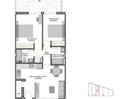 Entre en un luminoso salón que conecta a la perfección con el comedor y una cocina totalmente equipada. Las grandes puertas correderas de cristal dejan entrar la luz natural, creando un ambiente abierto y acogedor. La distribución incluye dos amplios dormitorios, el principal con baño en-suite y un moderno baño familiar.