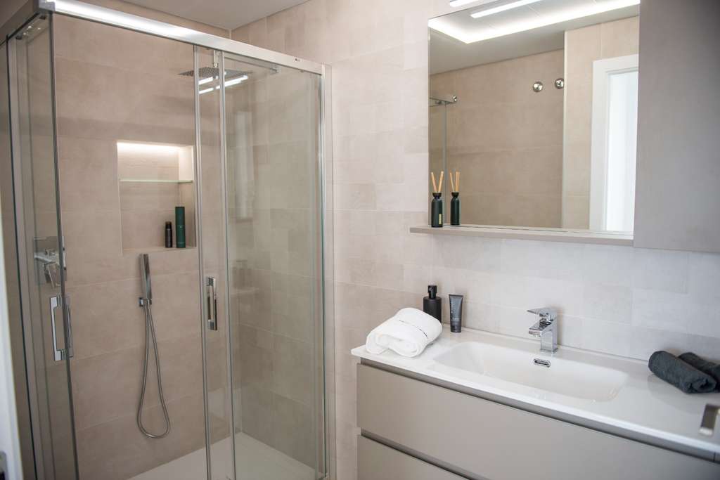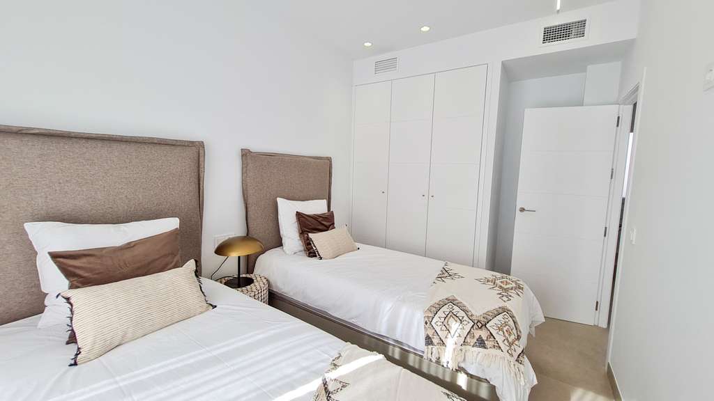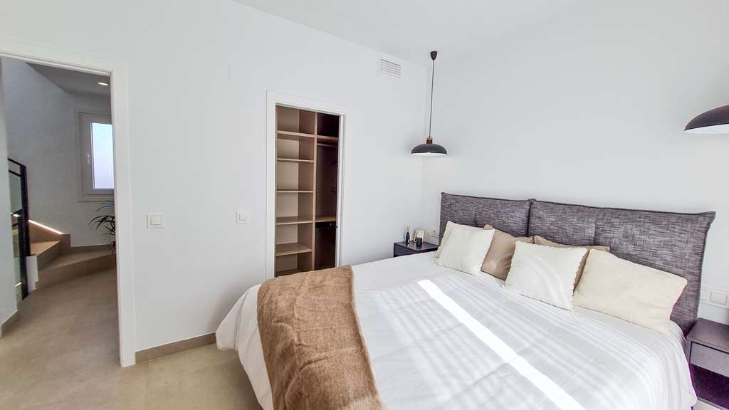 La planta superior ofrece más espacio y lujo con dos generosos dormitorios. Uno de ellos cuenta con un vestidor, mientras que el otro tiene un armario empotrado. Ambos dormitorios comparten un baño bien equipado y tienen acceso directo a terrazas soleadas, perfectas para momentos de relax o para disfrutar de las vistas. Como guinda del pastel, hay una amplia terraza en la azotea, ideal para los días soleados y las noches templadas.