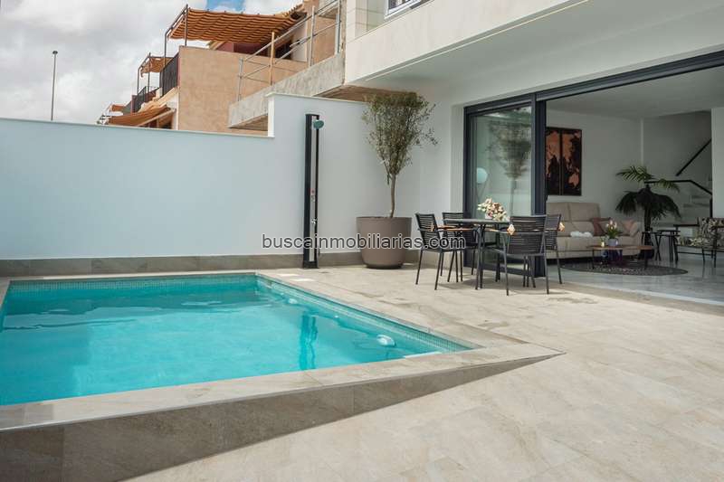 Las viviendas estarán disponibles en marzo y junio de 2025, con precios desde 439.000 euros. Cuentan con materiales de alta calidad, distribución optimizada y amplias zonas exteriores. La planta baja dispone de un luminoso salón-comedor con grandes ventanales que permiten la entrada de luz natural, cocina equipada con electrodomésticos, un dormitorio doble y un baño de visitas. Desde el salón se accede a la terraza con piscina privada de 13 m², ducha solar y zona de estar, creando un espacio perfecto para el descanso y el entretenimiento. La parcela de 173 m² incluye un camino privado para aparcamiento.