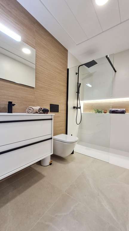 Cuartos de baño completos con mueble de lavabo, inodoro suspendido con cisterna incorporada, espejo, ducha con efecto lluvia y mamparas.