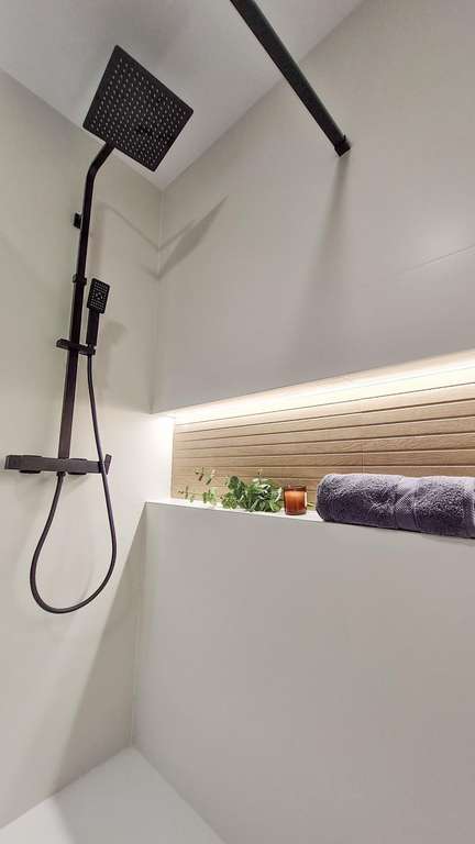 Cuartos de baño completos con mueble de lavabo, inodoro suspendido con cisterna incorporada, espejo, ducha con efecto lluvia y mamparas.
