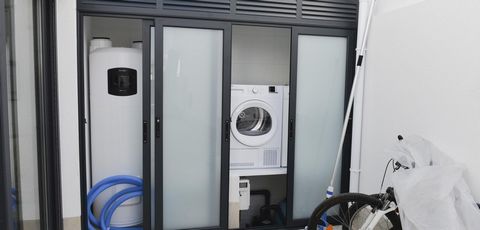Grandes ventanales en el salón dan acceso directo a la zona de la piscina, inundando el interior de luz natural. Complementos de eficiencia energética como paneles solares y preinstalación de aire acondicionado por conductos garantizan el confort moderno y la sostenibilidad. Los electrodomésticos Balay incluidos (placa de inducción, horno, microondas, campana extractora, frigorífico, lavavajillas integrado y lavadora) facilitan la mudanza.