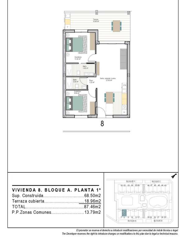 La promoción consta de 72 apartamentos de 2 y 3 dormitorios y 2 baños, uno de ellos en suite, distribuidos en cuatro modernos edificios. También está prevista una segunda fase con bungalows y villas, lo que añadirá aún más valor y atractivo a la zona.