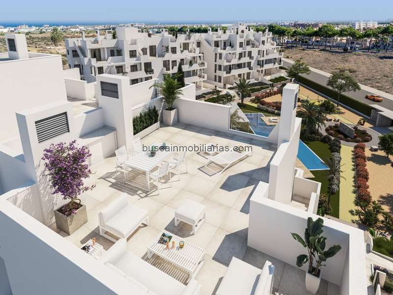Residencial de obra nueva con 60 apartamentos distribuidos en 4 bloques con zona de terrazas para planta baja, primera y segunda, piscina comunitaria, piscina climatizada y solarium con cocina de verano en los áticos, para disfrutar de todas las horas de sol todos los días del año.