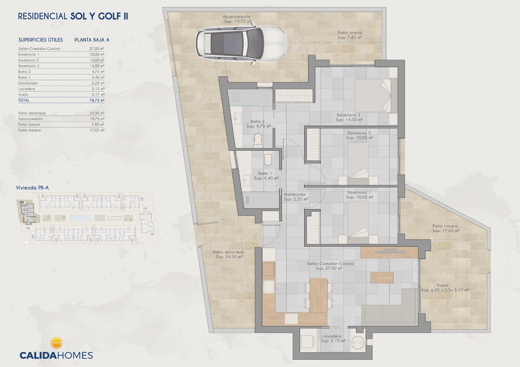 Comprar bungalow nuevo en Torre Pacheco es una oportunidad única para quienes buscan calidad, diseño y un entorno privilegiado. El bungalow PB-A, ubicado en la planta baja de la Fase 2 del residencial Sol y Golf, representa la esencia de la vivienda moderna y funcional en la Costa Cálida. Su arquitectura actual destaca por líneas limpias, espacios abiertos y una cuidada selección de materiales que aportan elegancia y confort.