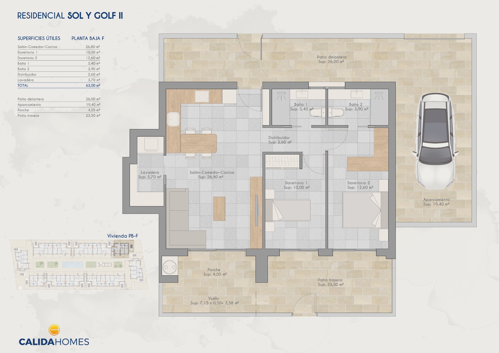 Situada en la exclusiva Fase 2 del Residencial Sol y Golf, esta vivienda de nueva construcción en venta en Torre Pacheco es ideal para quienes buscan un entorno soleado, tranquilo y bien conectado. Este bungalow de planta baja tipo F destaca por su diseño contemporáneo y funcional, pensado para ofrecerte todo el confort que necesitas.