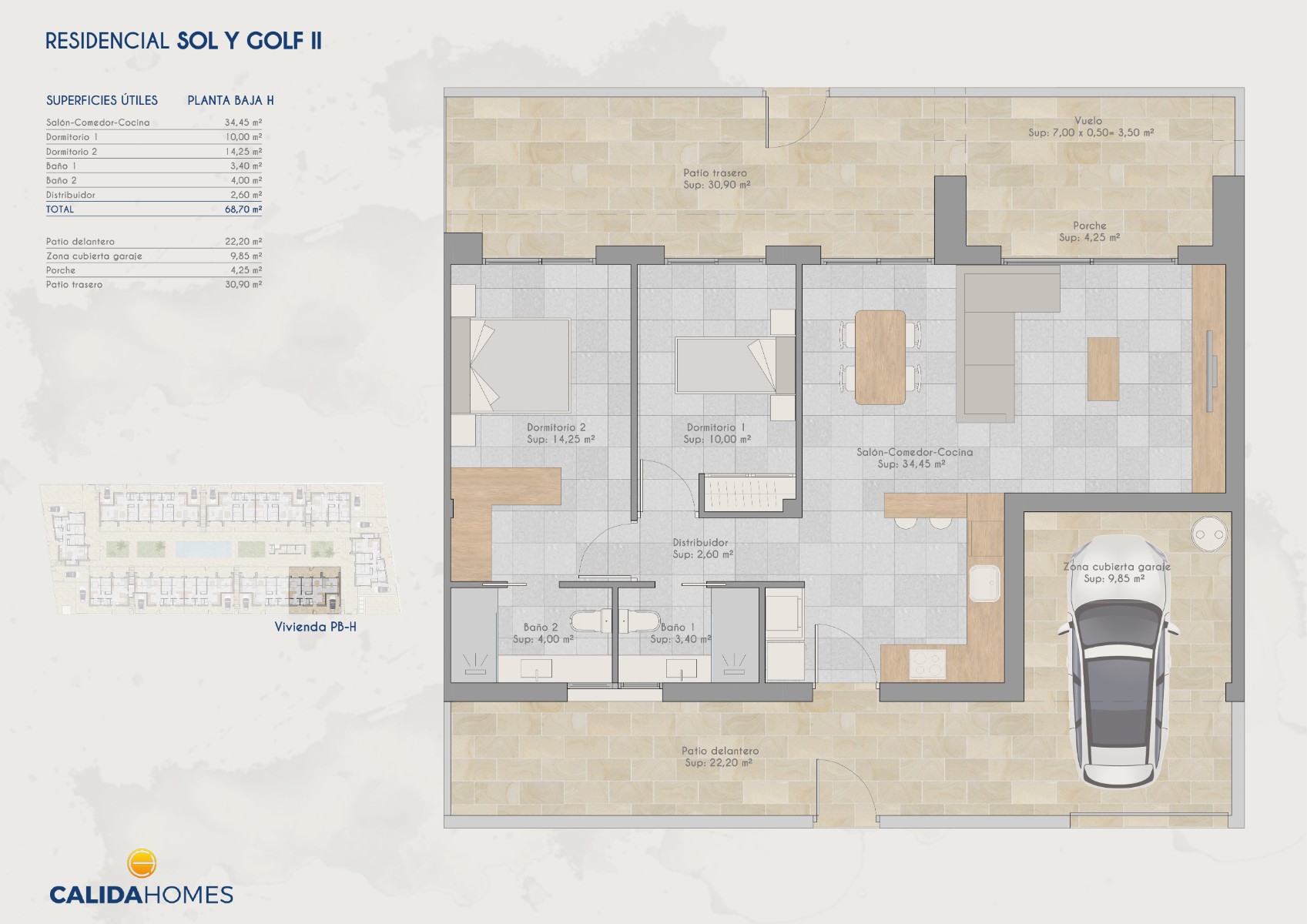 Este bungalow de nueva construcción en Costa Cálida, está ubicado en el Residencial Sol y Golf - Fase 2, que se está construyendo en Torre Pacheco. Es la opción perfecta para quienes buscan una vivienda confortable y lujosa en España. El bungalow de planta baja es el tipo H y acabará de construirse en el año 2027.