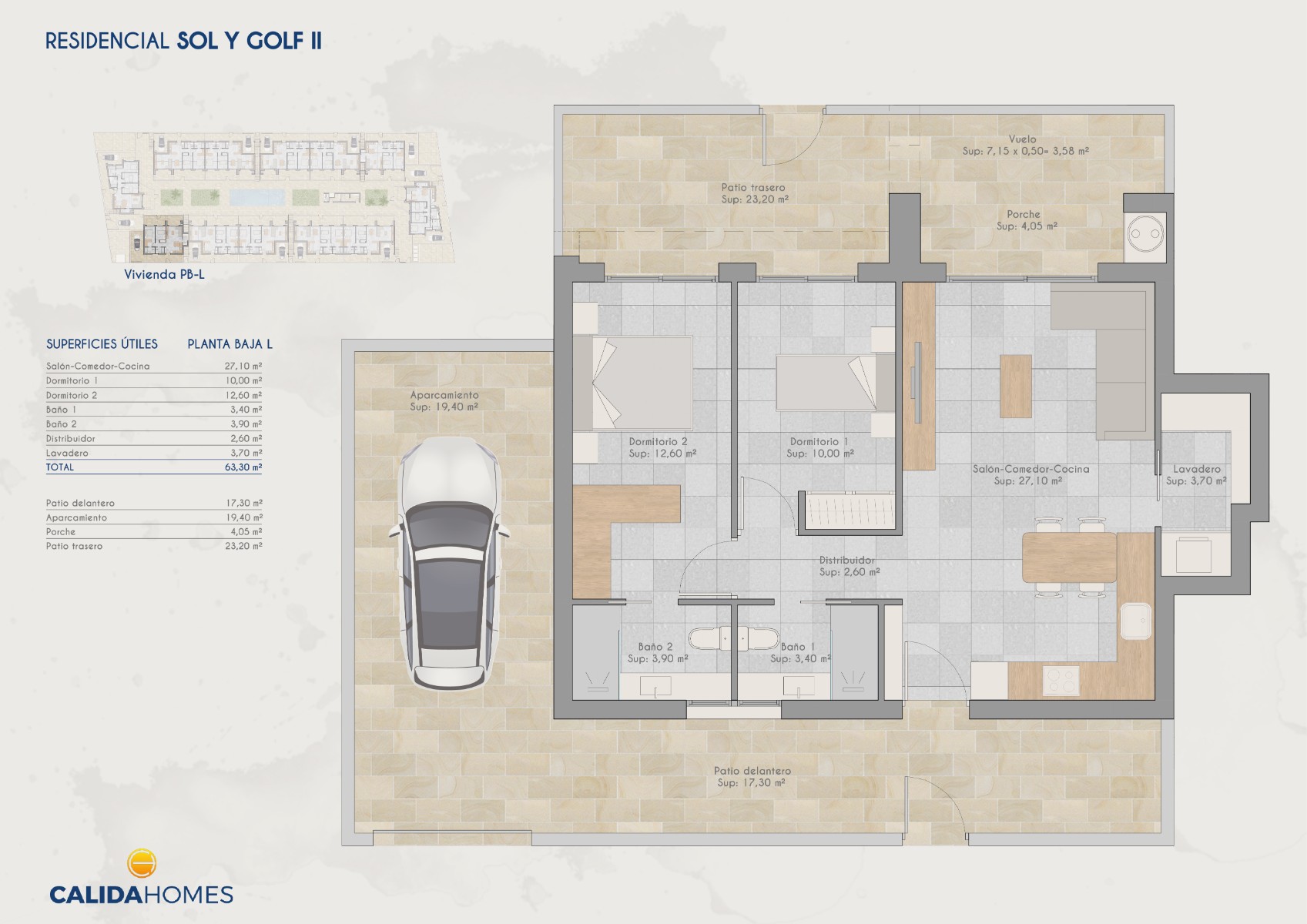 Está ubicado en una de las zonas más codiciadas de Torre Pacheco, a tan sólo 500 metros de un campo de golf de 9 hoyos. Sus 63 m² construidos están distribuidos en dos amplios dormitorios y dos baños. Los dormitorios, con armarios empotrados, ofrecen una luminosidad incomparable gracias a su orientación este. La cocina y los baños presentan un diseño moderno que cautivará a los amantes de la elegancia y la funcionalidad.