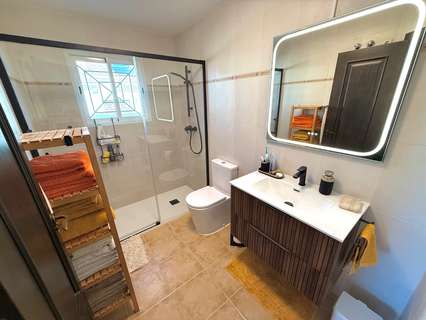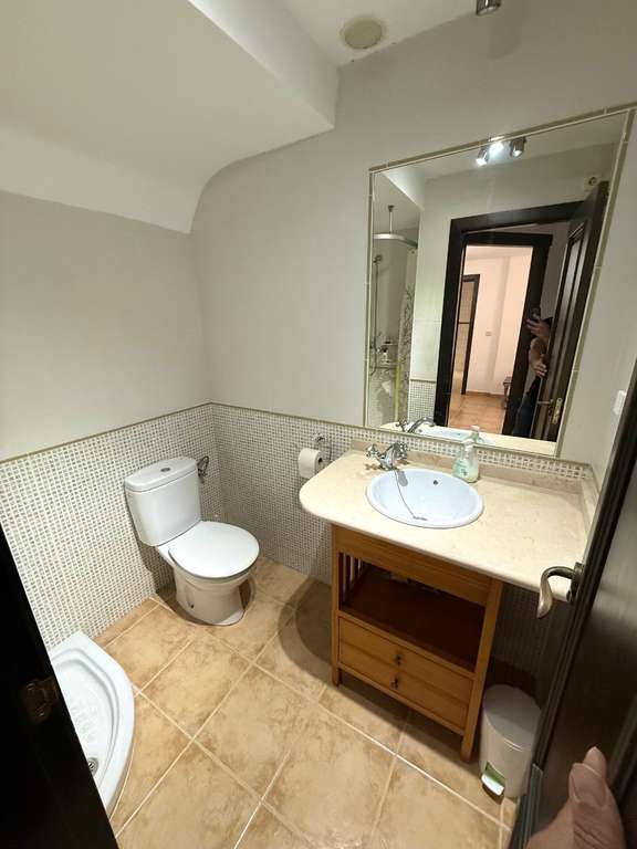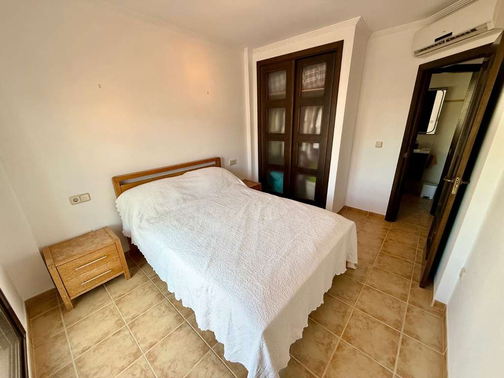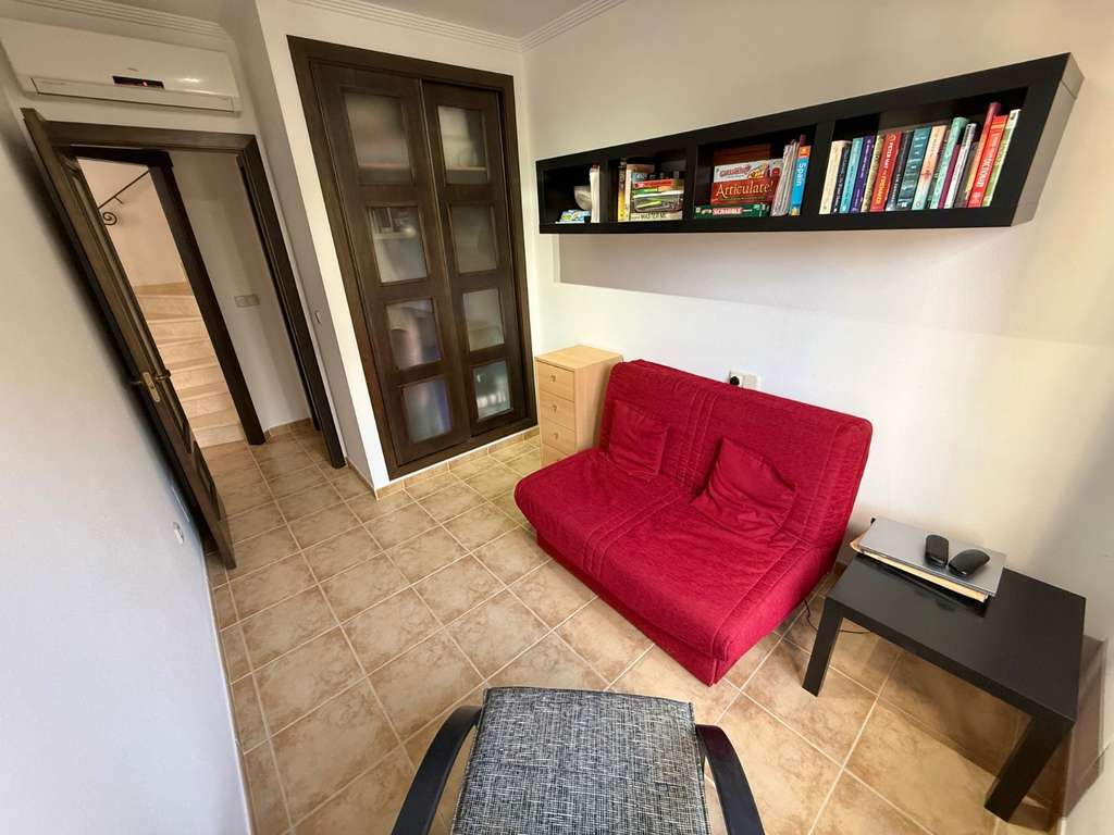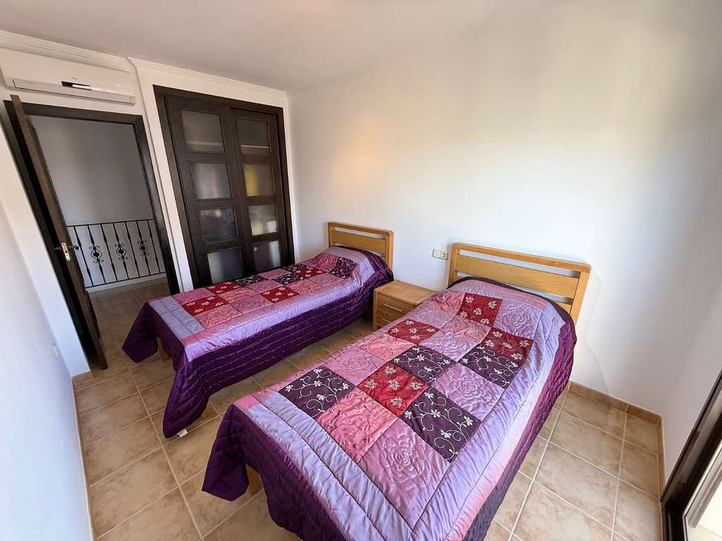 La escalera abierta del salón conduce a la primera planta. Hay dos amplios dormitorios, ambos con aire acondicionado, armarios empotrados y puertas correderas. El dormitorio principal tiene acceso al balcón mediante puertas correderas, mientras que el otro dormitorio cuenta con un balcón francés. El baño reformado cuenta con ducha a ras de suelo, inodoro y lavabo. Todas las ventanas del salón y de los dormitorios de la planta baja cuentan con persianas y rejas de seguridad. En la planta superior, ambos dormitorios tienen persianas, y el dormitorio principal también cuenta con rejas de seguridad adicionales.