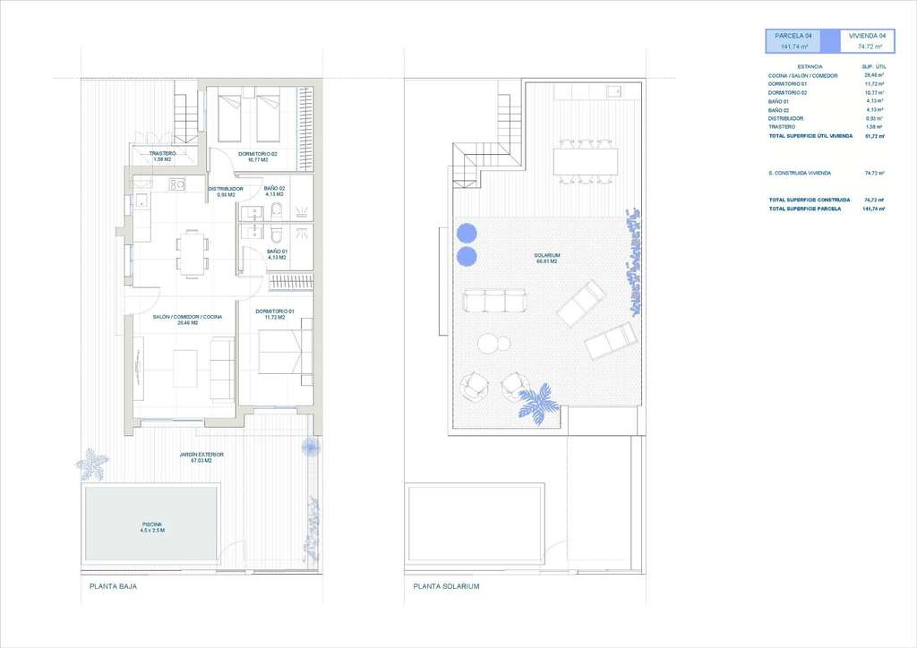 Villas modernas construidas en una sola planta, dispone de 2 o 3 dormitorios, 2 baños, cocina americana con el salón, armarios empotrados, solarium privado.