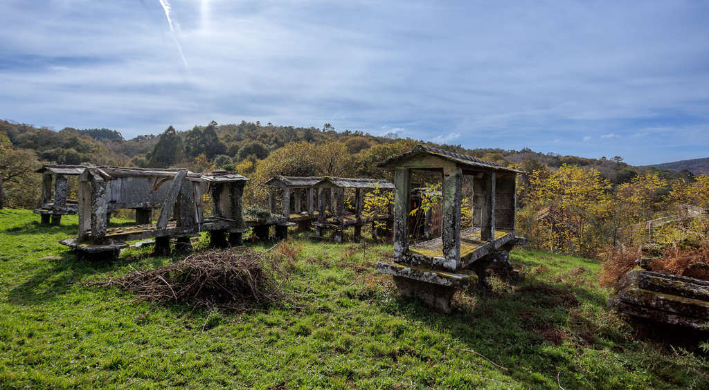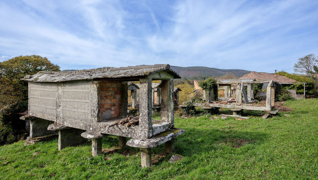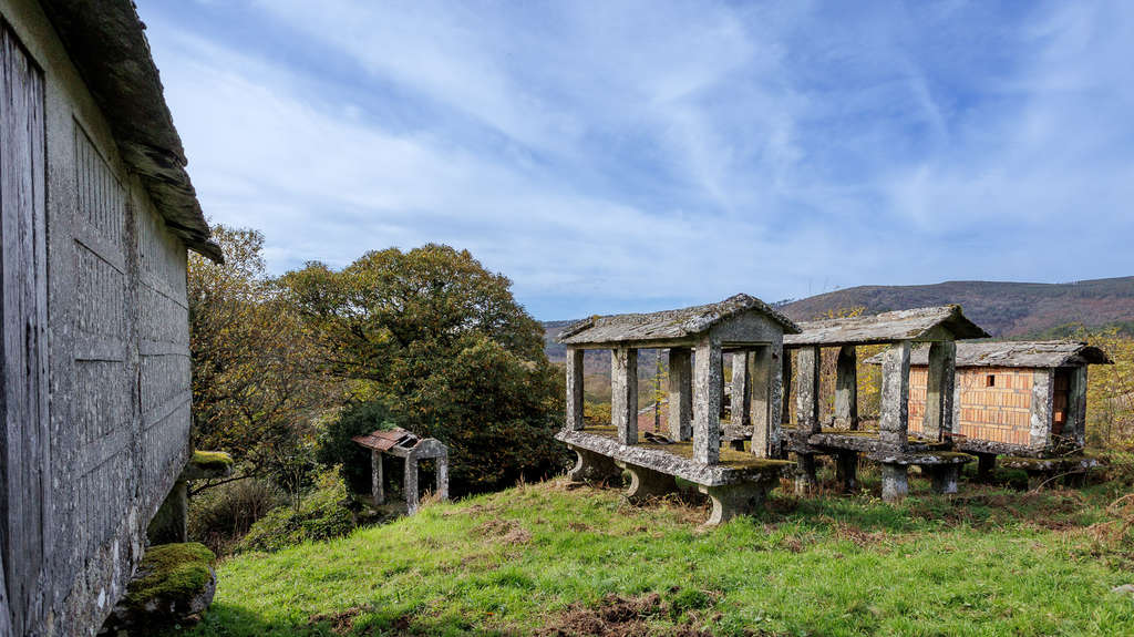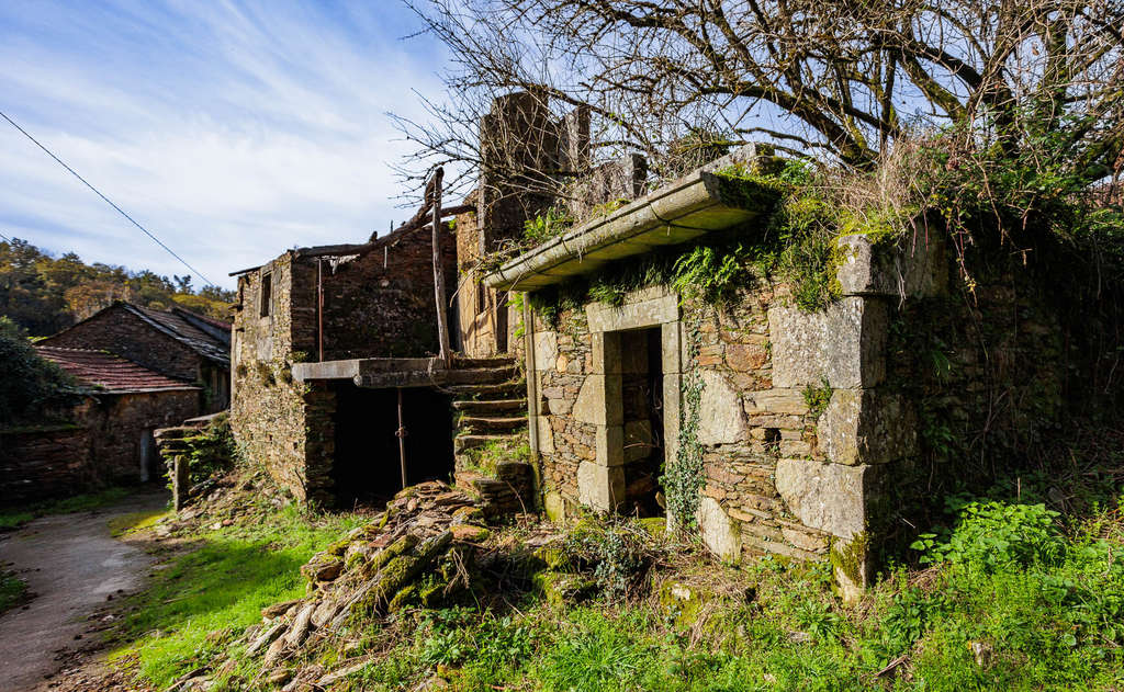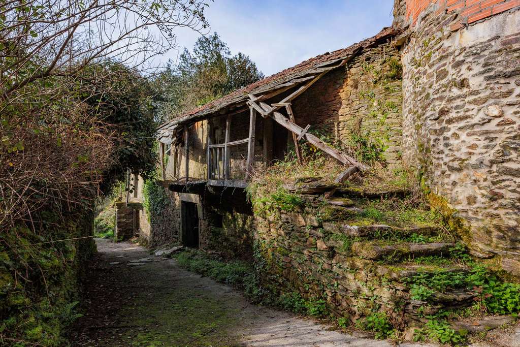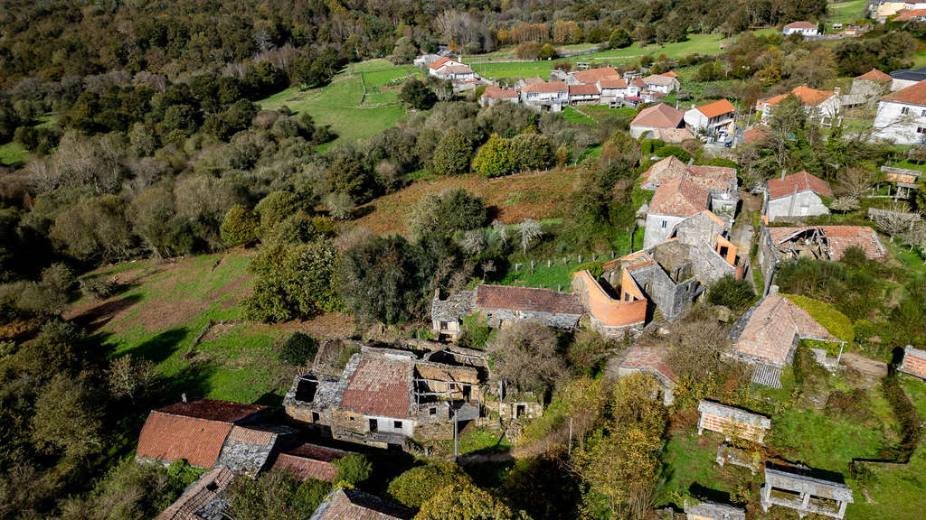 Este conjunto único se encuentra en Lebozán, Bearíz, a 40 km de Ourense. Comprende una aldea completa con 9 casas de piedra tradicionales distribuidas a lo largo de caminos empedrados, con 866 m² construidos sobre una superficie total de 617 m².