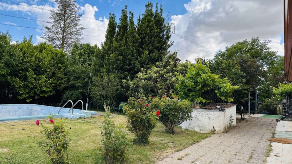 Junto al chalet podemos encontrar una gran piscina de obra para refrescarse en los dias calurosos y otras construcciones tales como sotechado para vehículos, terraza, cocina de verano, almacén, invernadero....