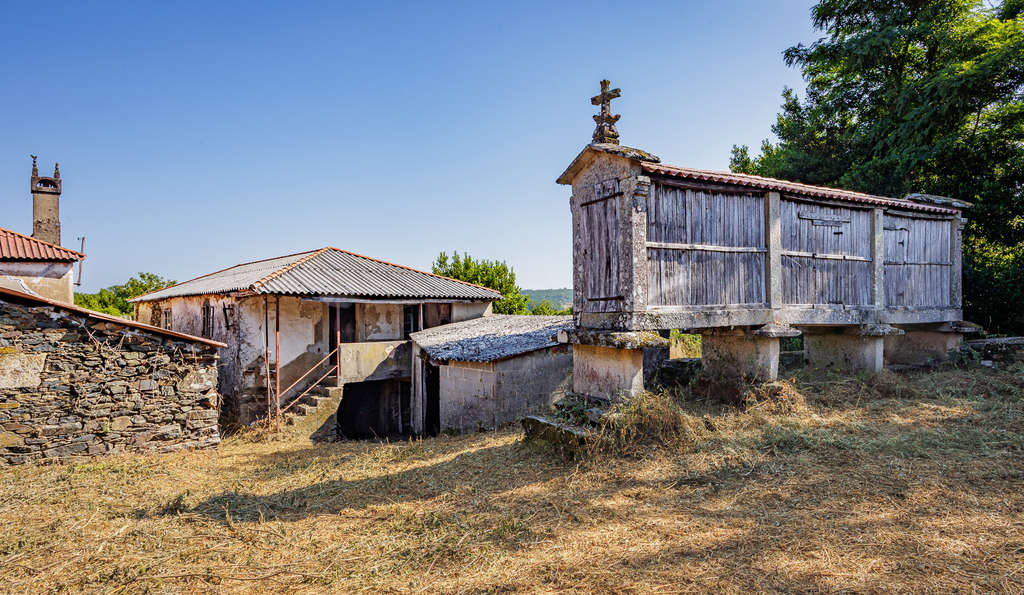 El conjunto incluye un hórreo gallego tradicional de tres claros bien conservado,así como dos alpendres (uno cerrado y otro abierto) que amplían las posibilidades.