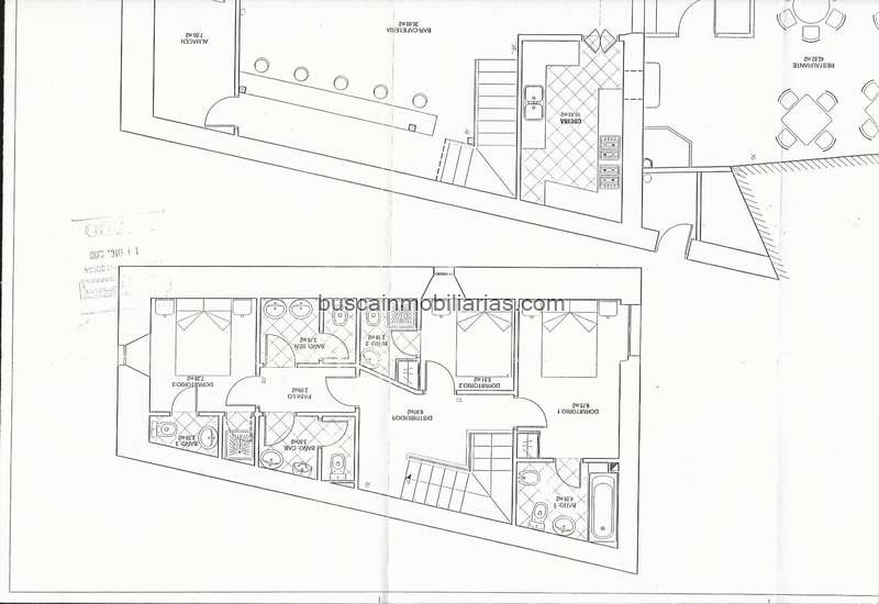 Planta primera: 3 dormitorios, cada uno con baño privado. Ideal para alojamiento turístico o familiar.