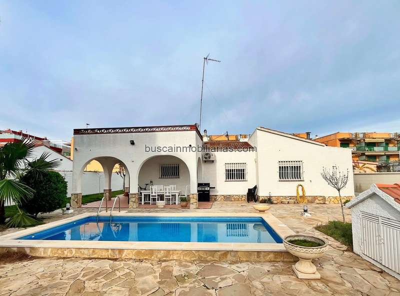 El chalet cuenta con una superficie construida de 124 m2 y se encuentra en una parcela completamente vallada, lo que garantiza privacidad y seguridad. En la parte trasera de la vivienda se encuentra una piscina privada de buen tamaño, mientras que la amplia terraza en la azotea es ideal para reuniones con familiares y amigos o simplemente para relajarse disfrutando de la brisa marina en las cálidas tardes de verano.