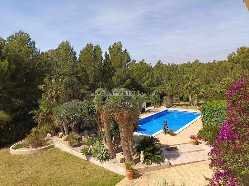 La zona de la piscina cuenta con una bonita pergolá natural, rodeada de árboles y plantas mediterraneas.