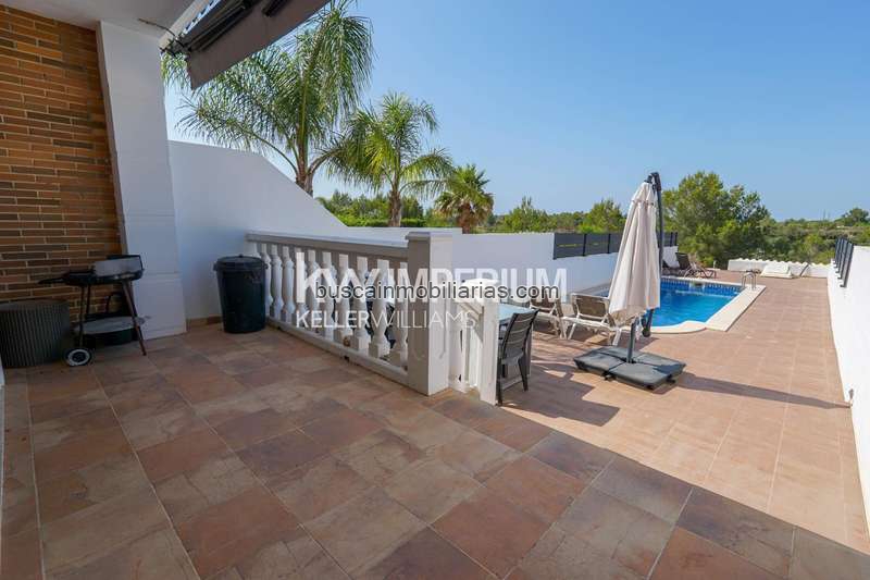 Perteneciente a un conjunto de adosados de obra vista, se accede a esta propiedad directamente desde la calle y subiendo unas escaleras se descubre una bonita piscina con zona de solárium que a su vez comunican directamente al acceso principal de la planta baja. Al atravesar el umbral de la puerta de entrada, nos da la bienvenida un moderno comedor-sala de estar con terraza frontal y vistas a la piscina. Desde este mismo espacio central, se accede a una moderna cocina totalmente equipada y a un baño completo con ducha que ofrece servicio a su vez una amplia habitación interior con salida a una terraza con comunicación a un pasaje exterior peatonal de la propia comunidad.