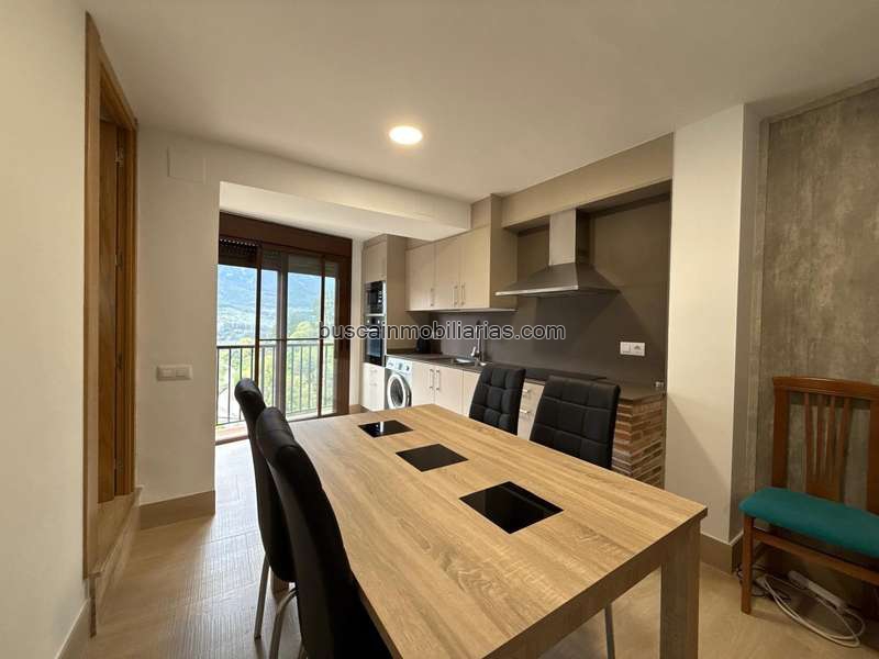 Primera planta: Cocina moderna de concepto abierto completamente equipada, unida a una luminosa sala de estar. También cuenta con un pequeño aseo y un balcón ideal para disfrutar del aire fresco de la montaña.