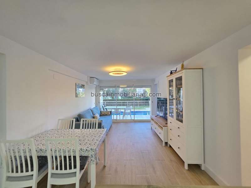 Piso de 2 habitaciones, 2 baños con ducha , recien reformado, con armarios empotrados, amplio salon-comedor con salida a terraza de 6m con vistas a la piscina, cocina americana equipada. Aire acopndicionado . Complejo residencial con jardines y piscina, situado a 300m de la playa. Perfecto para vivir todo el año por su cercania a todos los servicios o vacaiones.
