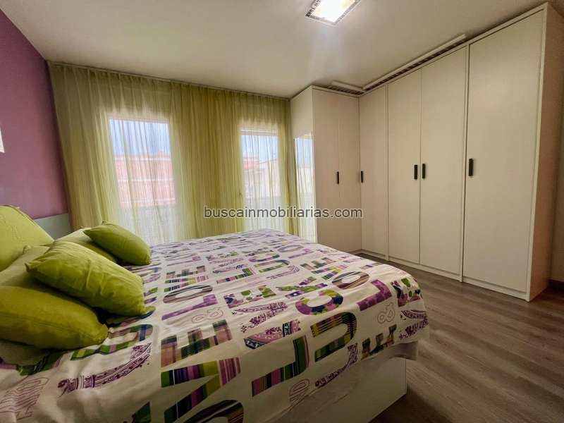 La vivienda cuenta con un amplio dormitorio doble con acceso a un balcón, dos habitaciones individuales, una cocina moderna totalmente equipada y un baño renovado con ducha. El salón es luminoso y espacioso, con grandes ventanales que aportan abundante luz natural.
