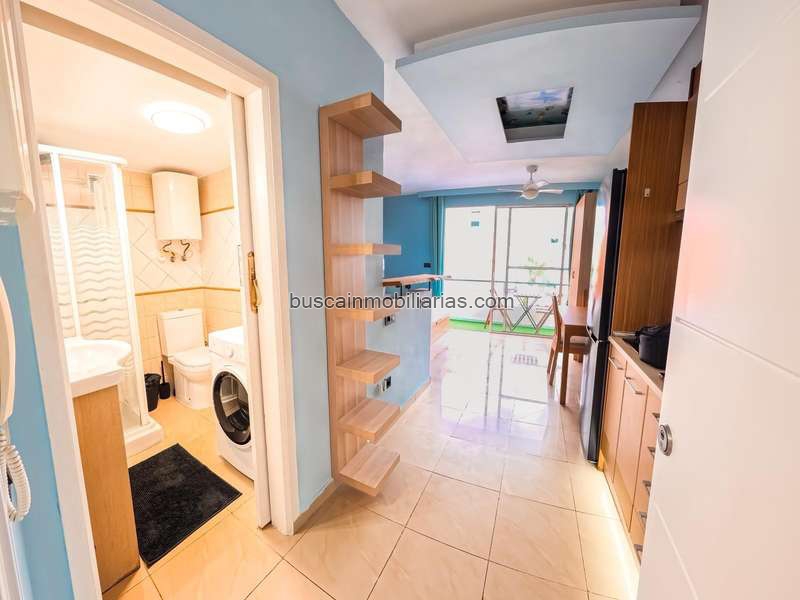 El estudio cuenta con un baño moderno de obra, equipado con plato de ducha, y una cocina completamente amueblada y equipada con todo lo necesario para el día a día. La zona principal dispone de espacio de salón y dormitorio integrado, decorado con estilo actual y pensado para aprovechar al máximo la luz natural.