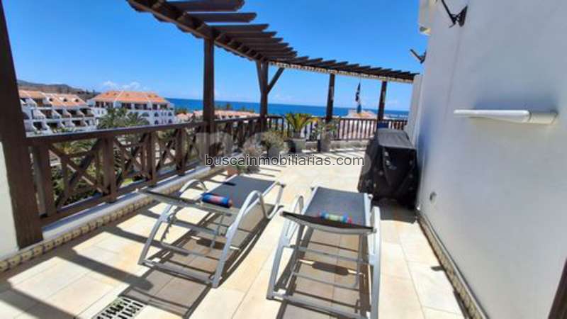 Referencia: 04330. Exclusivo Ático Dúplex en la planta superior de Torre Parque Santiago III, ubicado en primera línea de playa en la prestigiosa “Golden Mile” de Playa de Las Américas, a pocos pasos de la playa El Camisón. Con 91 m² construidos y una terraza privada de 71 m², ofrece vistas panorámicas al océano, las montañas, jardines tropicales y la piscina del complejo. En la planta inferior se encuentra un dormitorio principal con acceso directo a la terraza, un baño completo con bañera y ducha, un luminoso salón-comedor con grandes ventanales y una cocina moderna equipada con electrodomésticos de alta gama y barra de desayuno. La planta superior cuenta con un dormitorio de invitados con armario empotrado y un baño en suite con ducha a ras de suelo. La terraza, equipada con mobiliario exterior de calidad, incluye comedor, tumbonas y un armario de aluminio con lavadora y secadora integradas. La propiedad se vende amueblada, completamente renovada con materiales de alta calidad, ventanas de PVC-U, toldos eléctricos y acceso mediante ascensor. Lista para entrar a vivir.