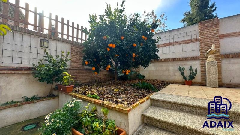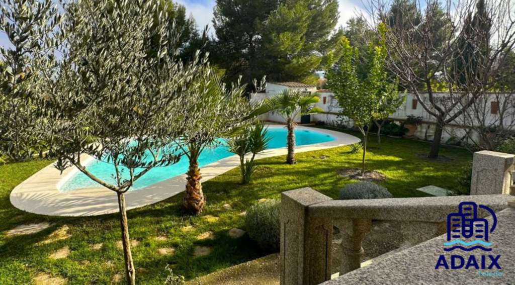 El jardín, completamente consolidado, combina césped natural, palmeras y arbolado, creando un entorno verde y privado alrededor de una espectacular piscina de agua turquesa.