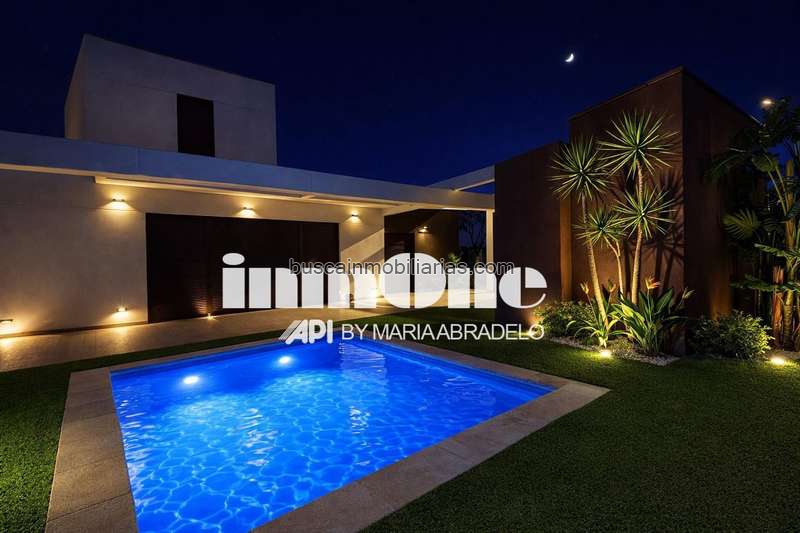 En el exterior, parcela privada con amplia terraza pavimentada a nivel del salón, porche/pérgola integrada, piscina privada, y zonas ajardinadas con césped, y plantas, fregadero y su zona de barbacoa.