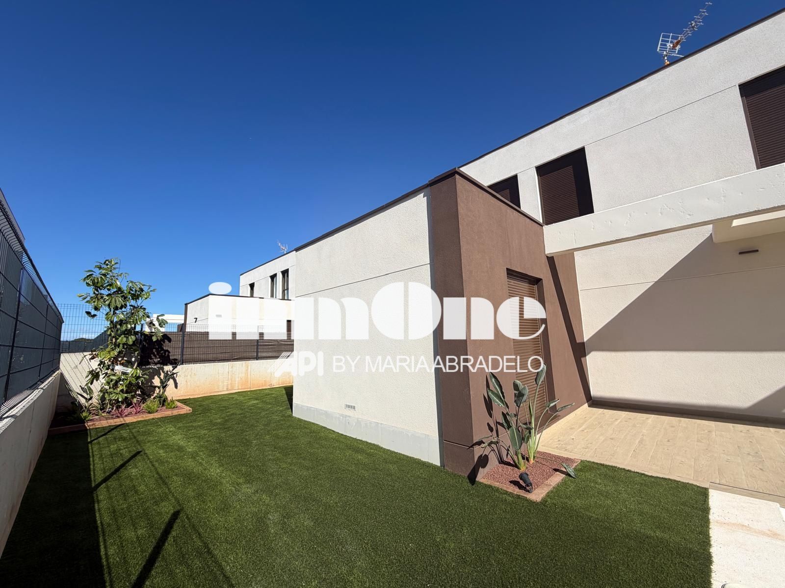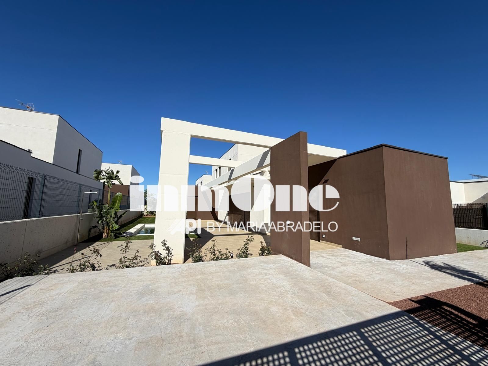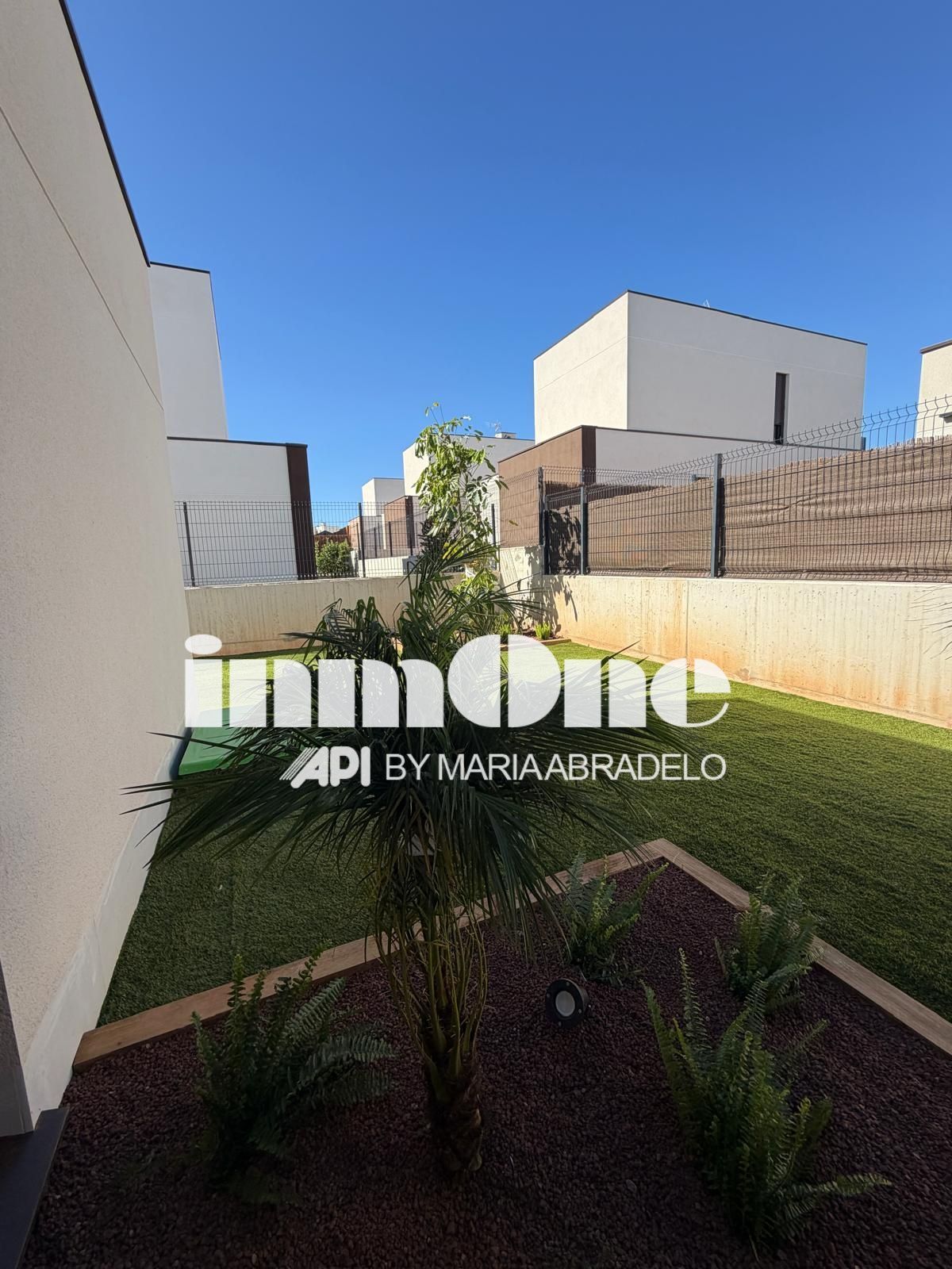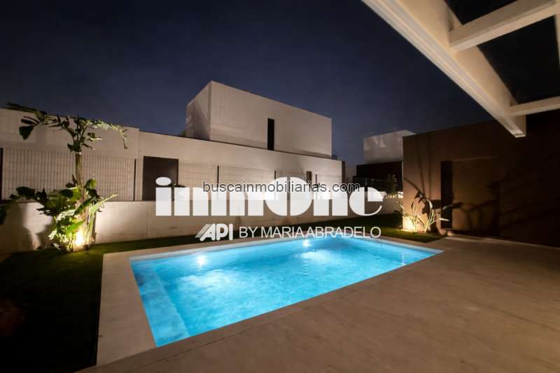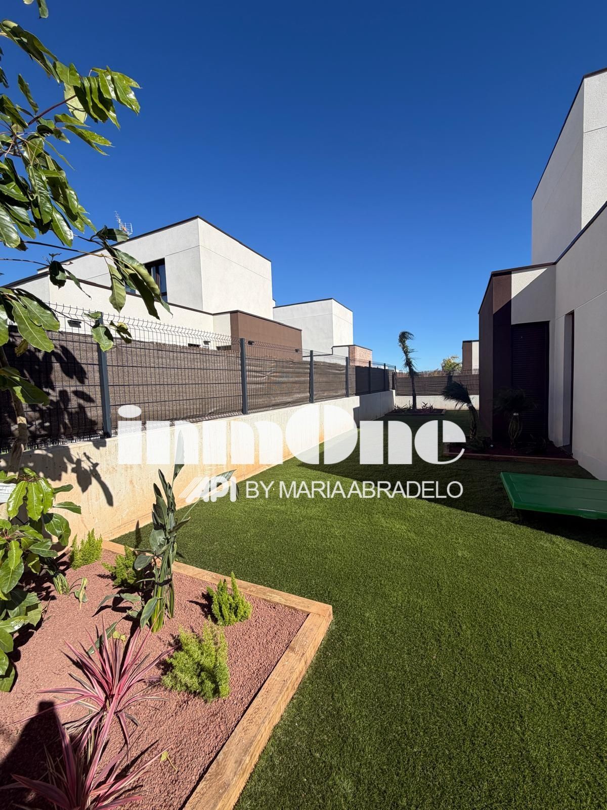 En el exterior, parcela privada con amplia terraza pavimentada a nivel del salón, porche/pérgola integrada, piscina privada, y zonas ajardinadas con césped, y plantas, riego automático, fregadero y su zona de barbacoa.