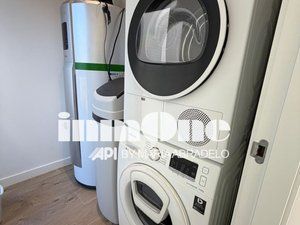 Cocina con isla central, abierta al salón, equipada con muebles en acabado blanco y madera, encimera de cuarzo, placa de inducción y campana extractora integrada en el techo. Electrodomésticos que incluyen horno y microondas en columna, frigorífico, y lavavajillas. Zona de lavado independiente equipada con lavadora y secadora, aerotermia y descalcificador.