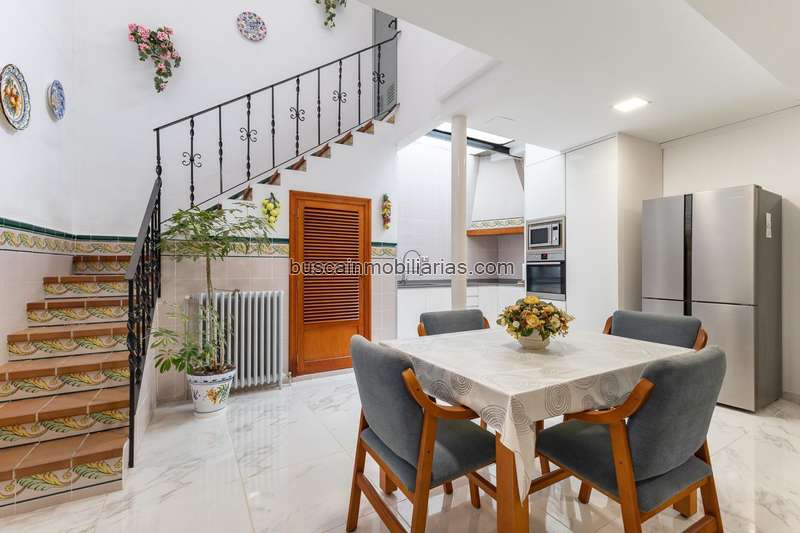 En la planta baja, nos encontramos un garaje con capacidad para dos vehículos, un amplio trastero, donde tiene ubicado el deposito de gasoil y caldera y una pequeña cocina de servicio con azulejo valenciano. Al entrar al inmueble, nos recibe una escalera señorial de mármol, hierro forjado y pasamanos de madera de nogal, que nos da acceso a las plantas superiores,
