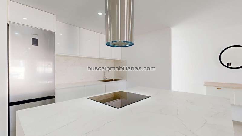 •Cocina: Mobiliario con armarios altos y bajos, electrodomésticos integrados, amplia encimera de material resistente con acabado blanco veteado, e isla central con placa de inducción y horno de alta gama. Campana extractora de diseño suspendida con salida de humos al exterior.