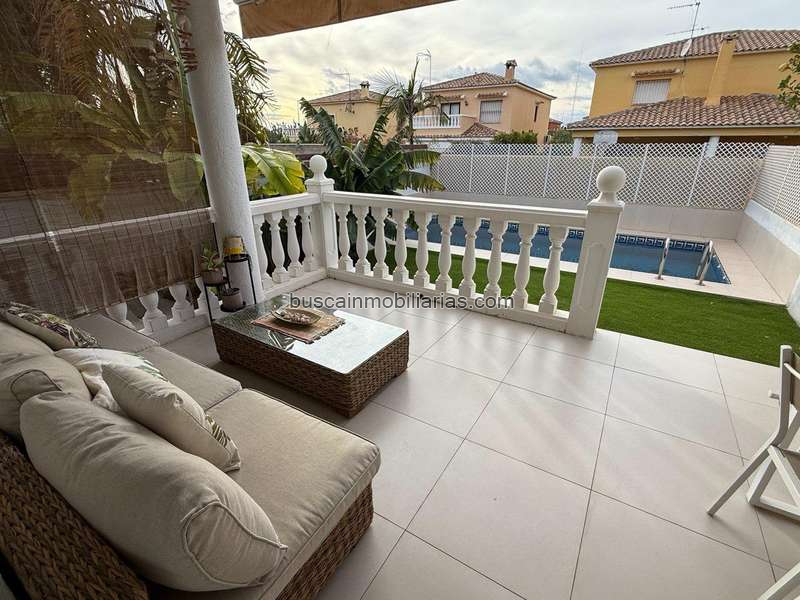 Casa adosada de dos plantas con jardín y piscina en alquiler.