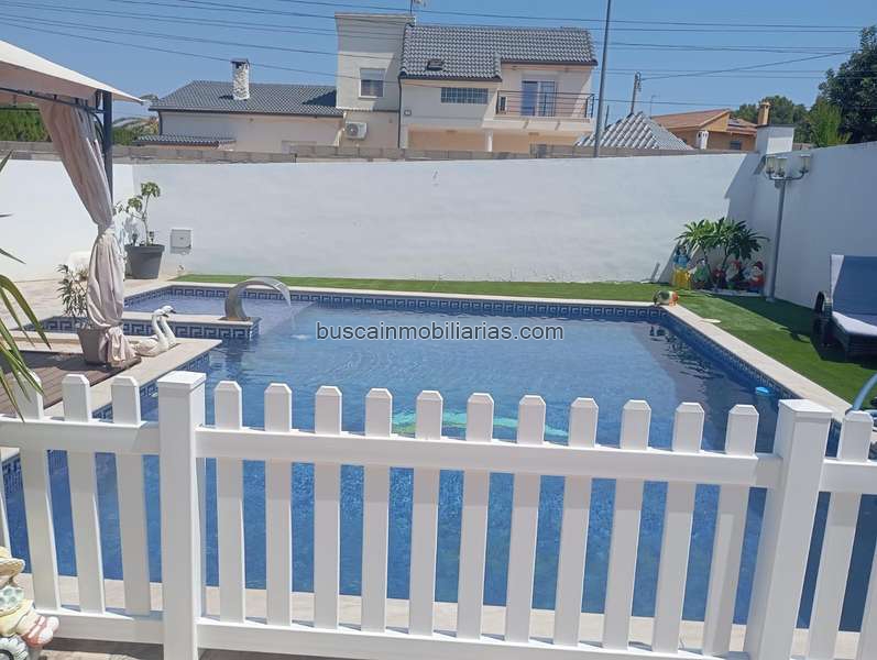 Exterior: La parcela cuenta con una gran piscina, ideal para disfrutar del clima mediterráneo, además de un paellero y un trastero que aportan funcionalidad y espacio adicional.