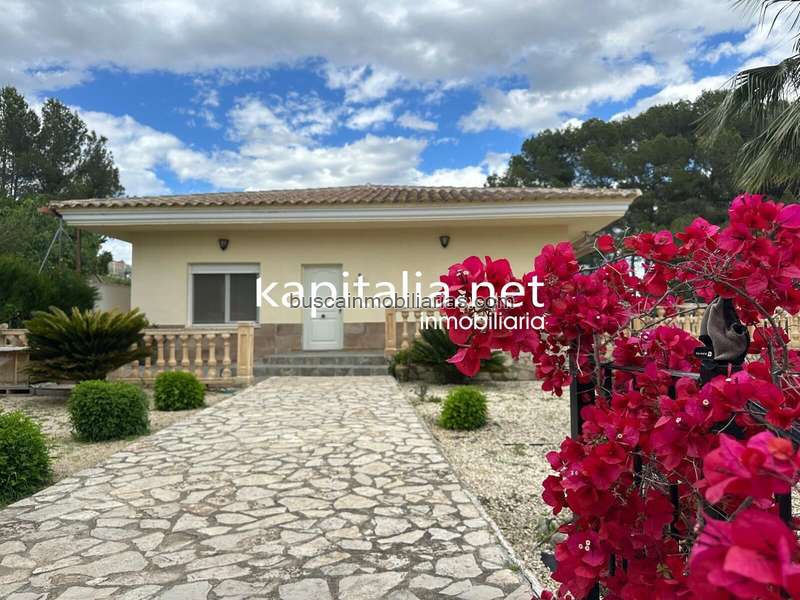 Chalet a la venta en L´Olleria (Valencia). Se ubica en zona tranquila pero a la vez muy próxima a todos los servicios de la población. Se trata de vivienda en una sola planta de 181m2 con antigüedad de aproximadamente 20 años. Se distribuye en amplio salón comedor con chimenea, espaciosa cocina con zona de comedor y acceso a lavandería, 4 habitaciones, 2 baños completos (uno con ducha y otro con bañera). La habitación principal cuenta con vestidor y baño en suite. Cuenta con terraza con vistas despejadas y bonitas. Carpintería exterior de aluminio climalit con mosquiteras, carpintería interior de madera, pavimentos de granito. Cuenta con dos preinstalaciones de splits de AA/CC en comedor y cocina. La casa se ubica en parcela de 1038m2 con una construcción destinada a aparcamiento con capacidad para dos coches junto con un trastero.