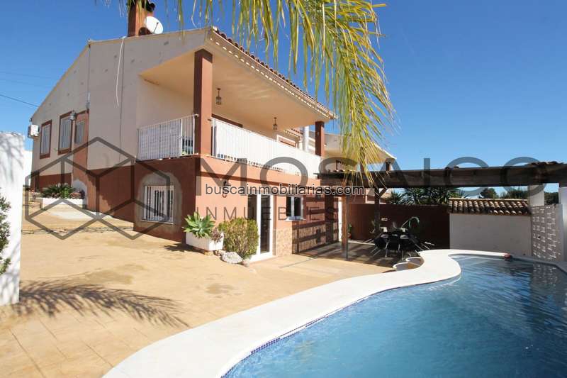 Los exteriores de la vivienda son muy prácticos, ya que dispone de gran parte de ella con hormigón impreso, lo que facilita su mantenimiento. Además dispone dos dos espacios de almacenaje exentos, una pequeña piscina para refrescarse y una ducha exterior. Junto a la piscina se encuentra una zona con pérgola fija de madera, que aporta zona sombreada para disfrutar durante los días más cálidos del verano.