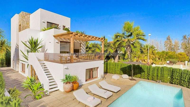 La villa contará con una piscina privada de 32 m2 y dos pérgolas de madera, una en la terraza y otra para el parking. Materiales y acabados de alta calidad en todo el inmueble. La ubicación ofrece vistas al mar y privacidad, con acceso directo a una playa natural.