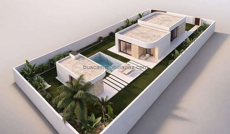 La vivienda se desarrolla en una sola planta, con 3 dormitorios y 2 baños completos, incluyendo un dormitorio principal tipo suite con vestidor y baño privado. El salón-comedor y la cocina se integran en un gran espacio abierto, con conexión directa al jardín y a la piscina, creando sensación de amplitud y luminosidad natural. La cocina está diseñada para ser moderna y funcional, con isla central y muebles altos y bajos, perfecta para cocinar y disfrutar en familia.