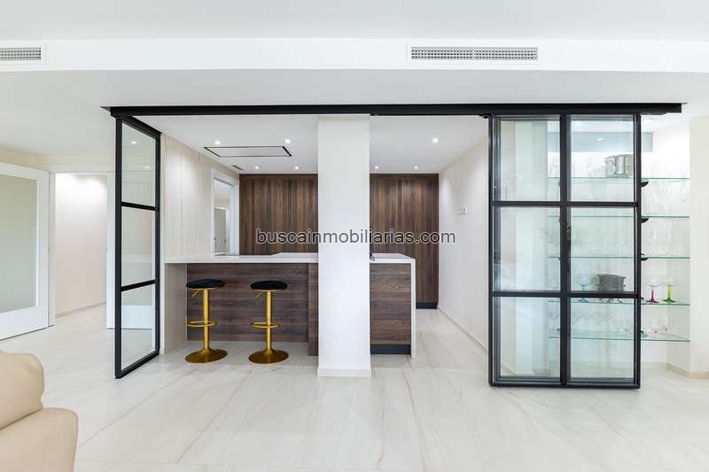 La cocina americana, equipada y moderna, se integra con el salón a través de una puerta corredera de elegante negro, que ofrece la versatilidad de disfrutar de un ambiente abierto o reservado según el momento. Todo ello sobre un suelo de piezas porcelánicas de gran formato (120x120 cm) que aportan distinción y carácter a la vivienda.