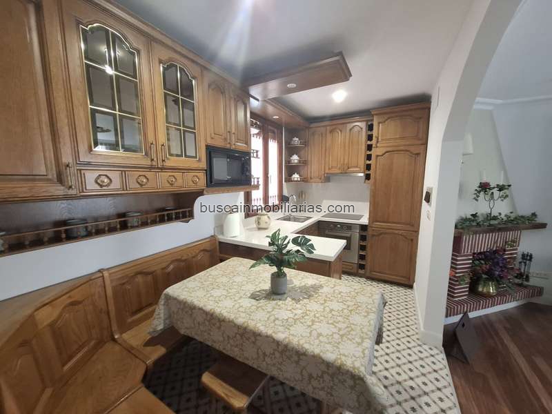 El salón es muy luminoso gracias a sus grandes ventanales, y está dividido en dos ambientes: una cálida zona de estar con chimenea de obra y una zona de comedor. La cocina, completamente equipada y abierta al salón, incluye una práctica despensa y espacio para comer.